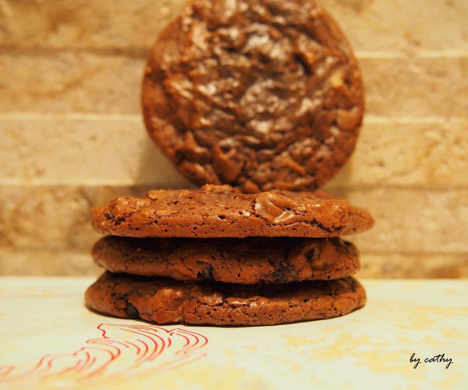 Se topeste ciocolata cu untul la bain marie.Ingredientele uscate se amesteca bine impreuna dupa care se adauga oul si se omogenizeaza.Se toarna ciocolata si untul caldut si se amesteca.Apoi nucile si stafidele.Dupa care amestecul se da la frigider pana a doua zi sau minim o ora.Biscuitii i am facut bilute de 50 de grame si i am aplatizat dar nu mult ii prefer mai grosuti. Asa mi s au parut mai buni in sectiune(si dupa doua zile de stat in frigider...).